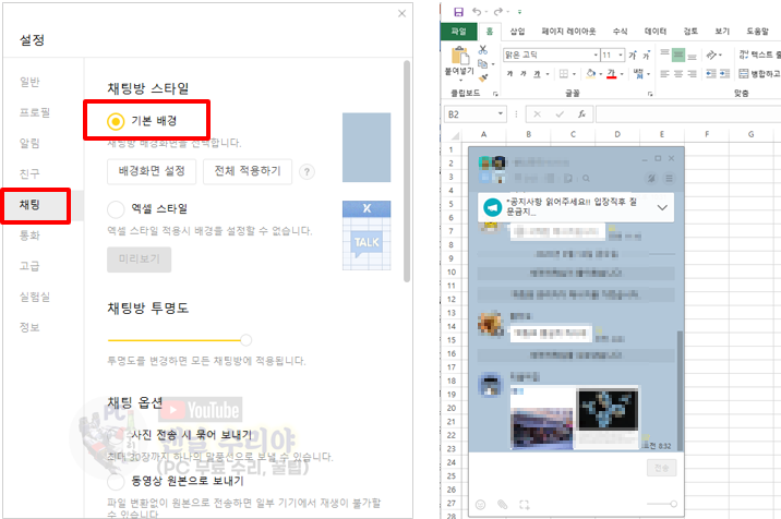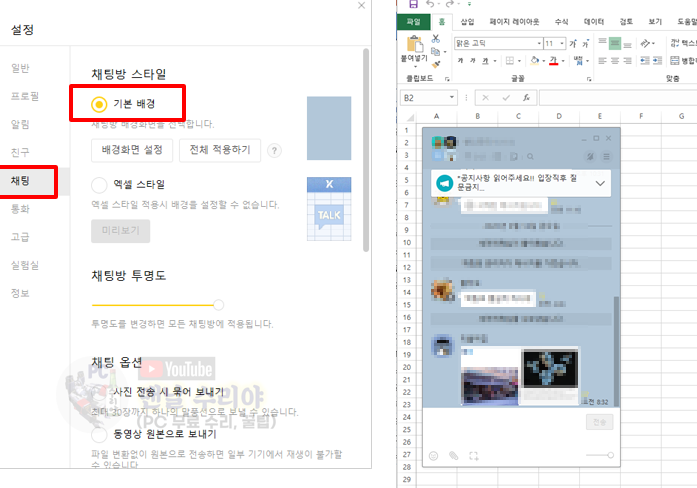 7) 혹시 이 엑셀 배경이 거슬려서, 기본 배경이 좋다고 하신다면 [채팅방 투명도]만 조절해도 충분할 수 있다.