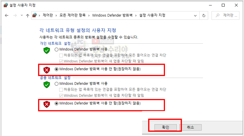 5) 현재는 녹색 방패 2개에 선택이 되어있을텐데, 빨간색 X 방패로 둘다 선택해주고 [확인] 클릭