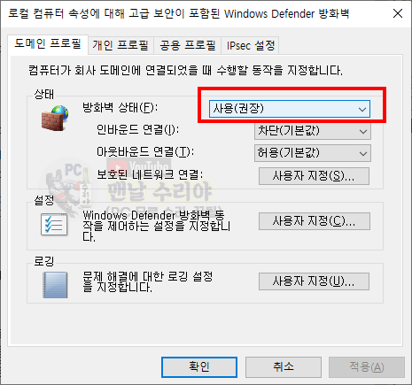 8) 작은 창이 나타날텐데 [방화벽 상태] 가 [사용 (권장)]으로 되어있을 것이다.
