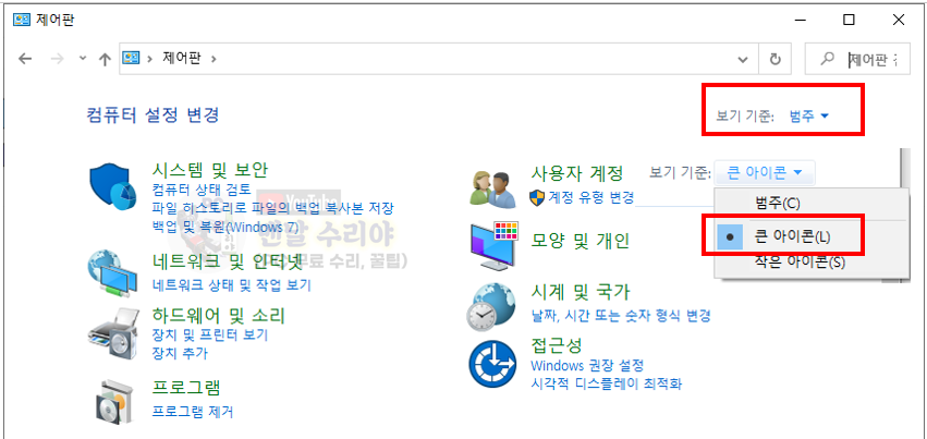2) 제어판 우측상단에서 [보기 기준] 범주 > 큰 아이콘 으로 변경