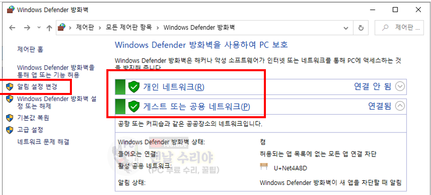 4) 현재는 개인네트워크, 게스트 또는 공용 네트워크가 초록색의 on 상태일텐데, 좌측의 [알림 설정 변경]을 클릭한다