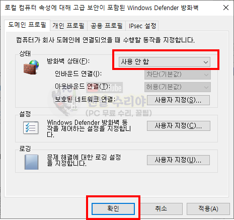이부분을 [사용 안함]으로 바꾸고 [확인]을 누르면 끝이다.