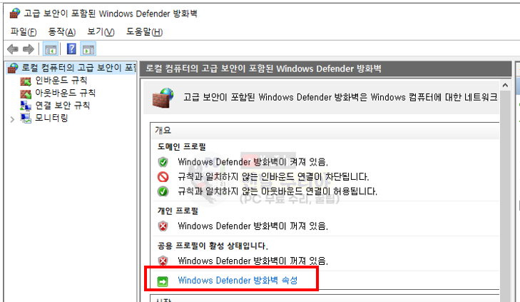 7) 아래와 같은 화면이 나타날텐데, [Windows Defender 방화벽 속성] 을 클릭해보자
