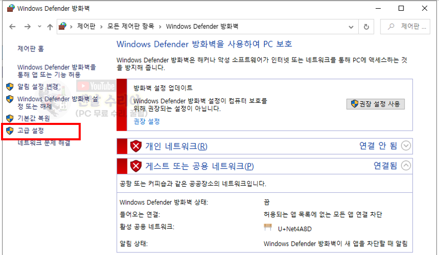 6) 그럼 이제 개인네트워크, 게스트 또는 공용 네트워크가 모두 빨간 X 방패로 변했다.