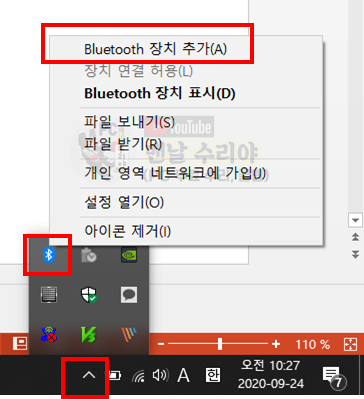 1) 먼저 윈도우 작업표시줄 우측 하단에 아래와 같은 화살표를 클릭 후, 블루투스 아이콘에 마우스를 가져간다.
