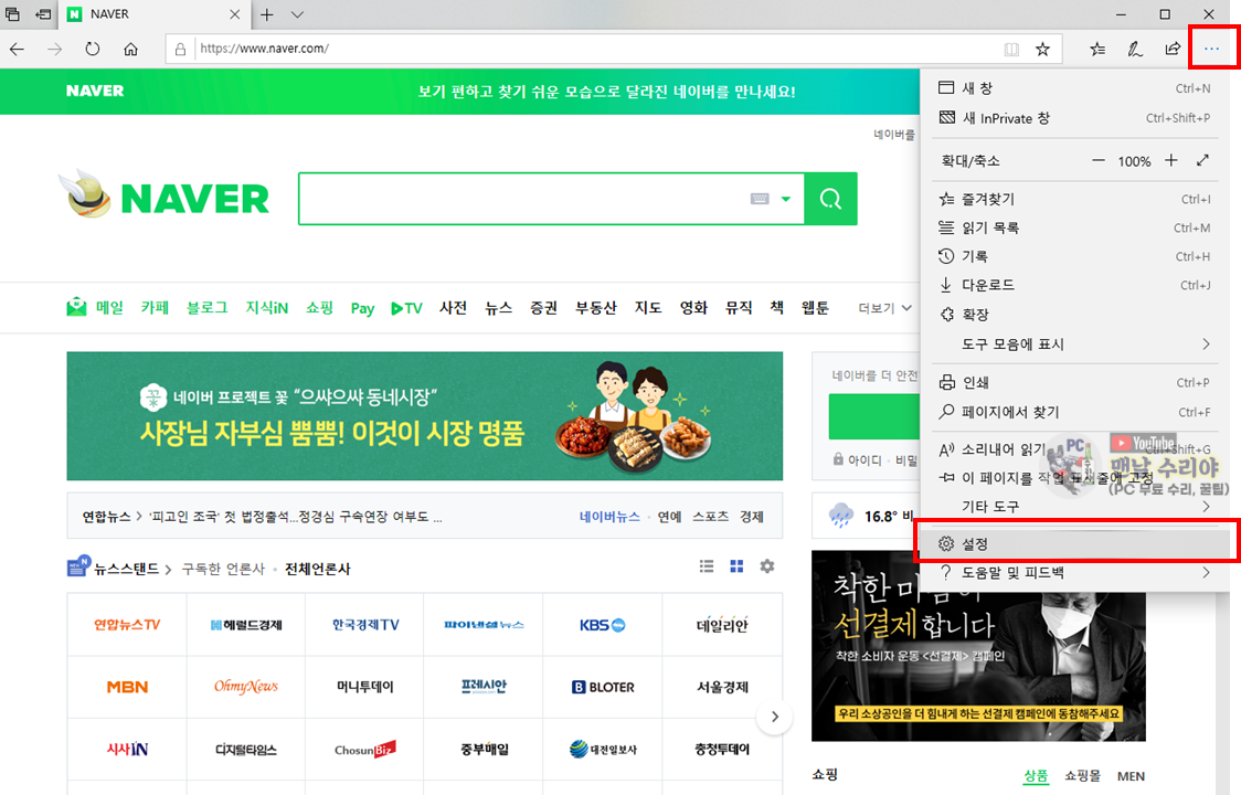 1) 먼저, 엣지 (Edge)를 실행 -> 우측 상단 [3개의 점] 클릭 -> [설정] 클릭