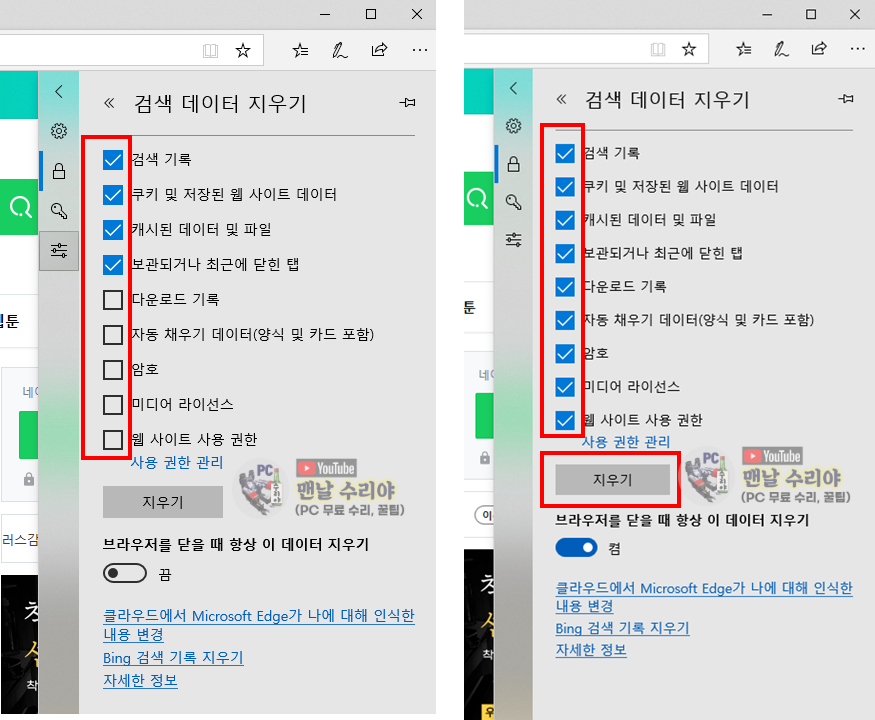 4) 검색기록, 쿠키, 캐시 데이터, 다운로드 기록등 자신이 원하는 항목을 체크 후, [지우기] 클릭
