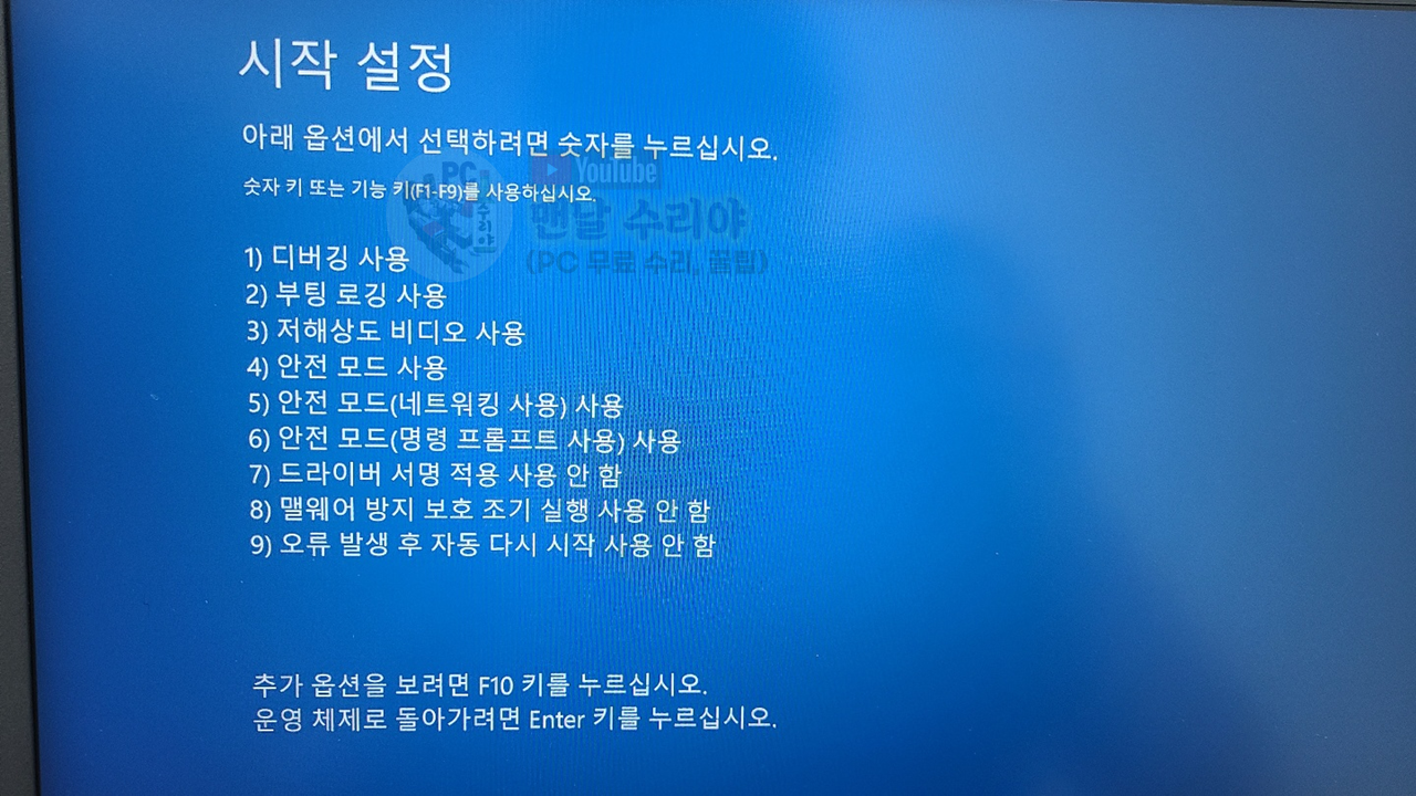 3) 그 다음 PC를 재부팅하면, 이번에도 역시 아래와 같이 파란화면이 뜰텐데, 1번의 방법을 참고하시라