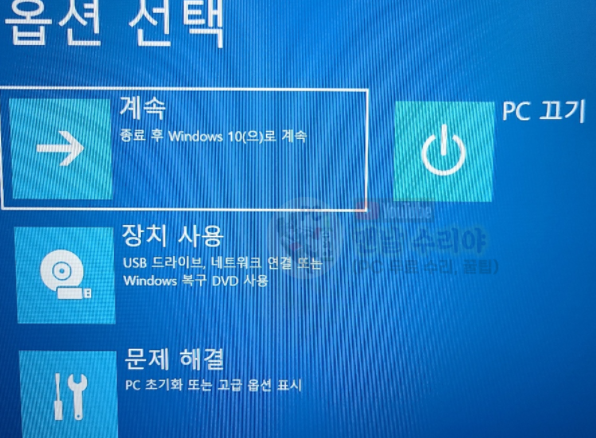 3-1) 혹시 위의 검은 화면이 안뜨고, 아래처럼 맨 처음봤던 파란 화면이 뜬다면 1번의 방법을 중간부터 따라하시면 된다