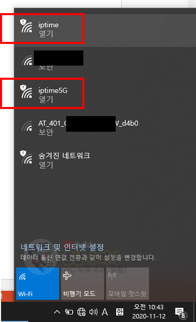 8) 최근 공유기는 기본적으로 [ iptime5G / iptime ] 이렇게 2개의 와이파이가 있을것이고,