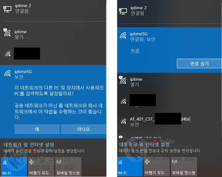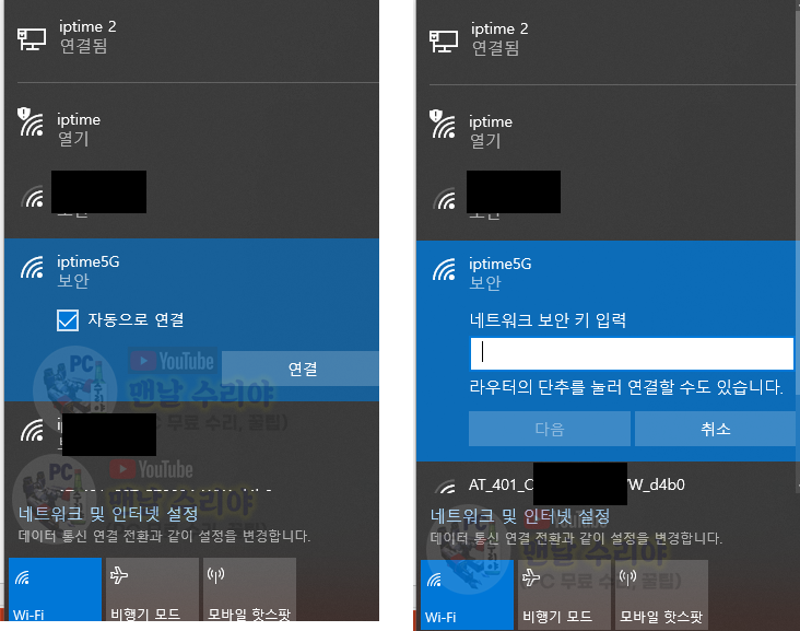 아래화면은 노트북에서 와이파이를 접속하는 과정.