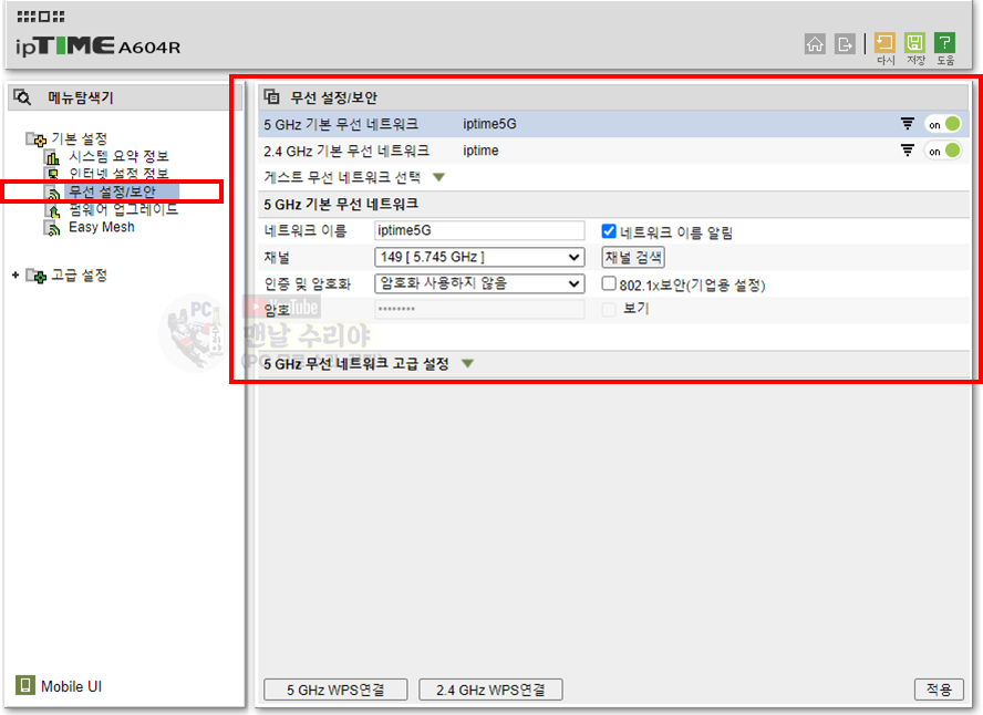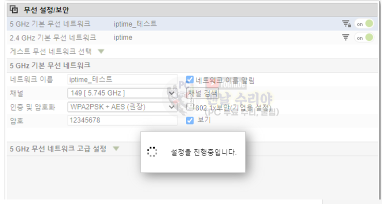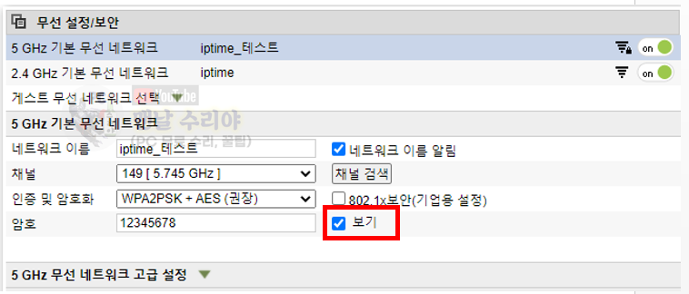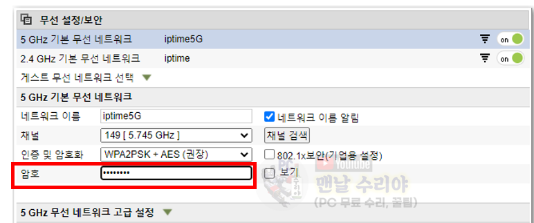 이 ipTIME 공유기의 와이파이 비밀번호 설정이나 변경방법을 찾으시는거라면,