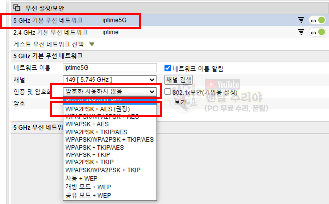 이를 [ WPA2PSK + AES 권장 ] 으로 바꿔준다.