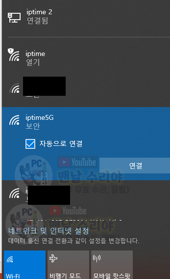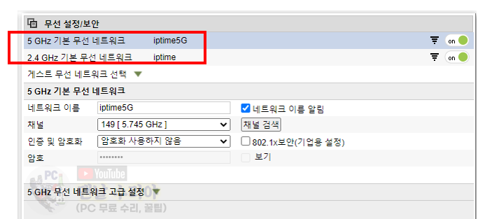 7) 아래를 보면, 와이파이가 iptime5G, iptime 이렇게 2종류가 있는데, 각기 다른 와이파이이다.