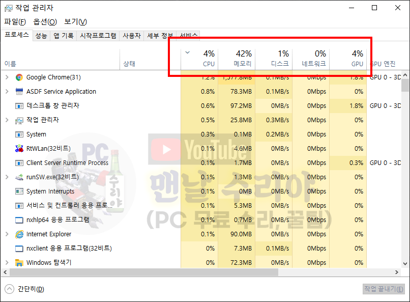 그러면 아래와 같이 작업관리자라는 창이 나오며, 각 자원에 대한 점유율이 나온다 (아래 빨간 네모)