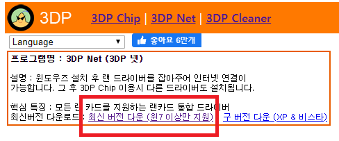 프로그램명 : 3DP Net (3DP 넷) 설명 : 윈도우즈 설치 후 랜 드라이버를 잡아주어 인터넷 연결이 가능합니다. 그 후 3DP Chip 이용시 다른 드라이버도 설치됩니다. 핵심 특징 : 모든 랜 카드를 지원하는