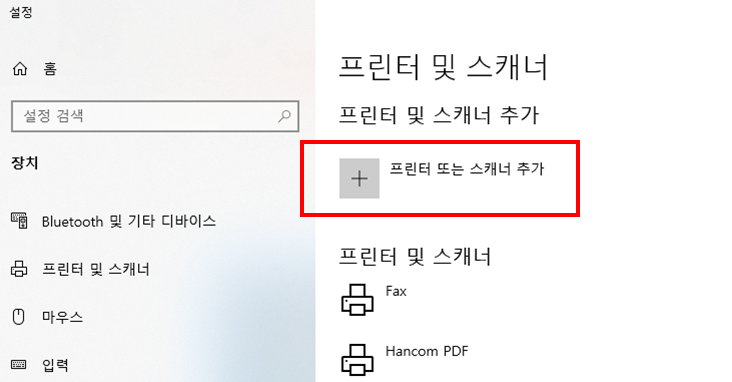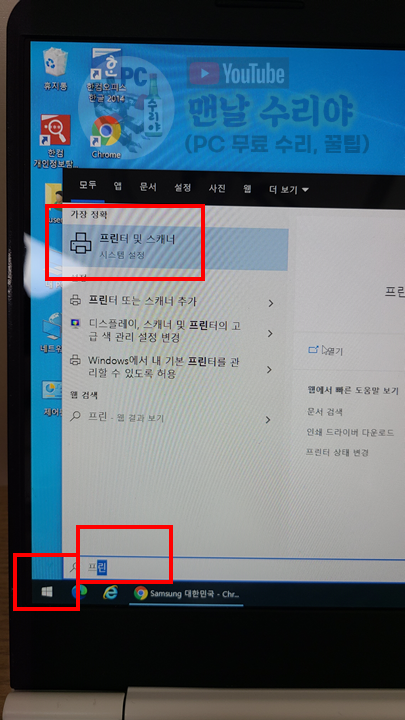 1) 윈도우 시작버튼 > 프린터 및 스캐너 검색 후 실행