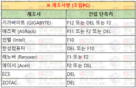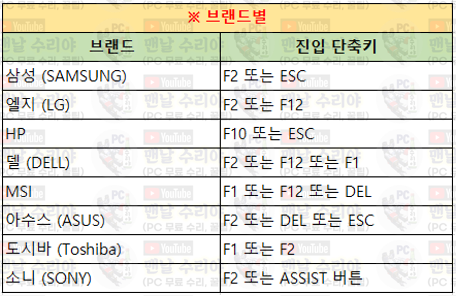 윈도우 부팅이 안되거나, 하드 인식이 안되거나, USB 윈도우 설치 부팅이 필요한 경우, 바이오스 (BIOS) 화면에 진입해야하는 경우가 있다. BIOS 화면은 부팅시에 단축키를 몇번 톡 톡 톡 눌러주면 진입이 되는데, 이 바이오스에 들어가는 방법과 진입 단축키는 PC의 브랜드마다, 메인보드의 제조사마다 다르다. 그리하여, 모든 컴퓨터 제조사별 바이오스 (BIOS) 진입 단축키를 아래와 같이 정리해놓았다.