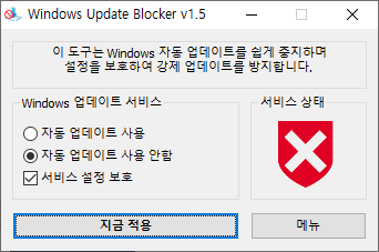 [자동 업데이트 사용 안 함] 선택 후 [지금 적용]을 누르면 끝이다.