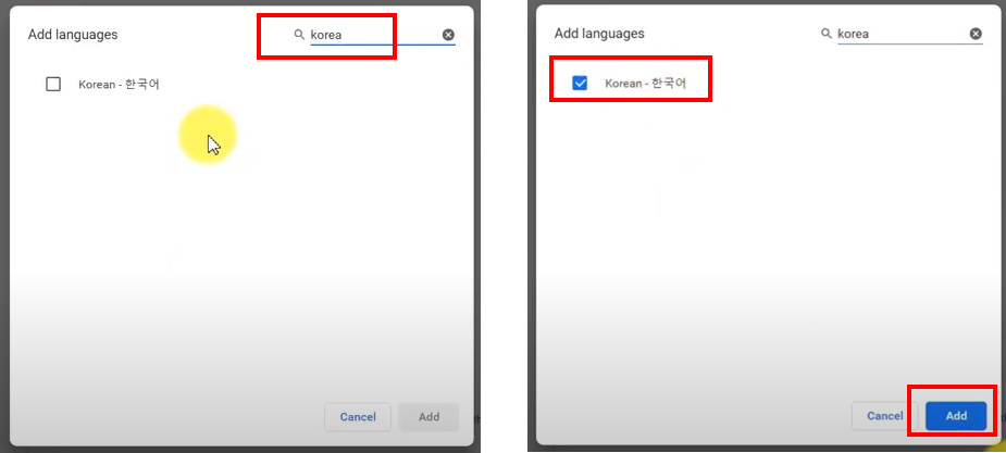 4) korean - 한국어를 검색하고, 체크한 다음에 Add를 클릭합니다