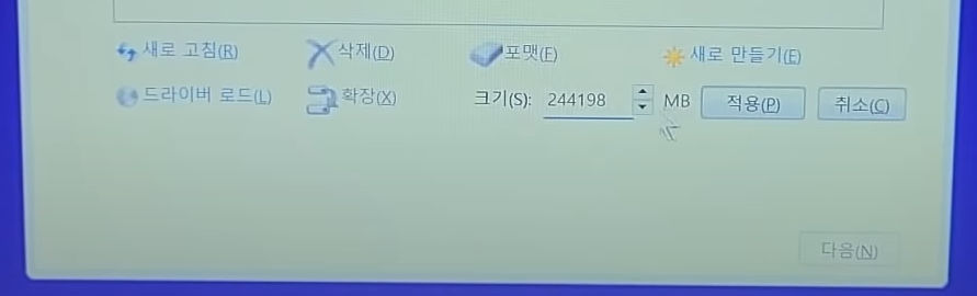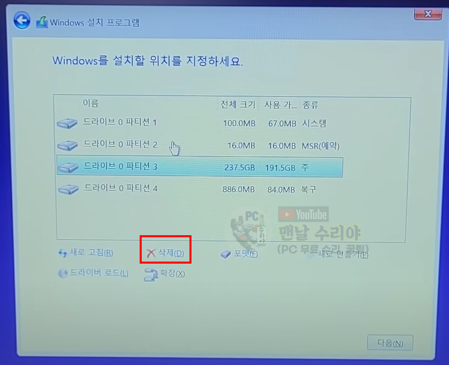 이미 윈도우10을 사용하고 있었기에, 파티션이 4개나 잡혀있는데 모두 [삭제]하여 1개로 통합해주세요.
