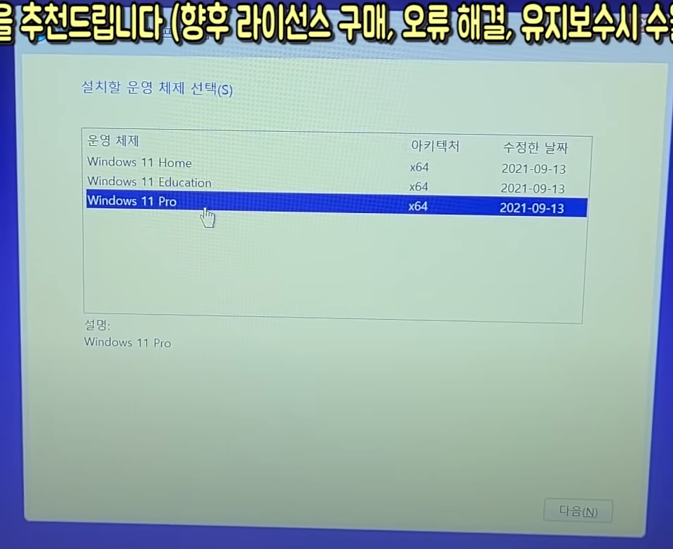 4) 아래 단계에서 3가지 종류, Windows 11 Home, Education, Pro 중에서 1개를 선택할 수 있는데, Pro를 추천드립니다.