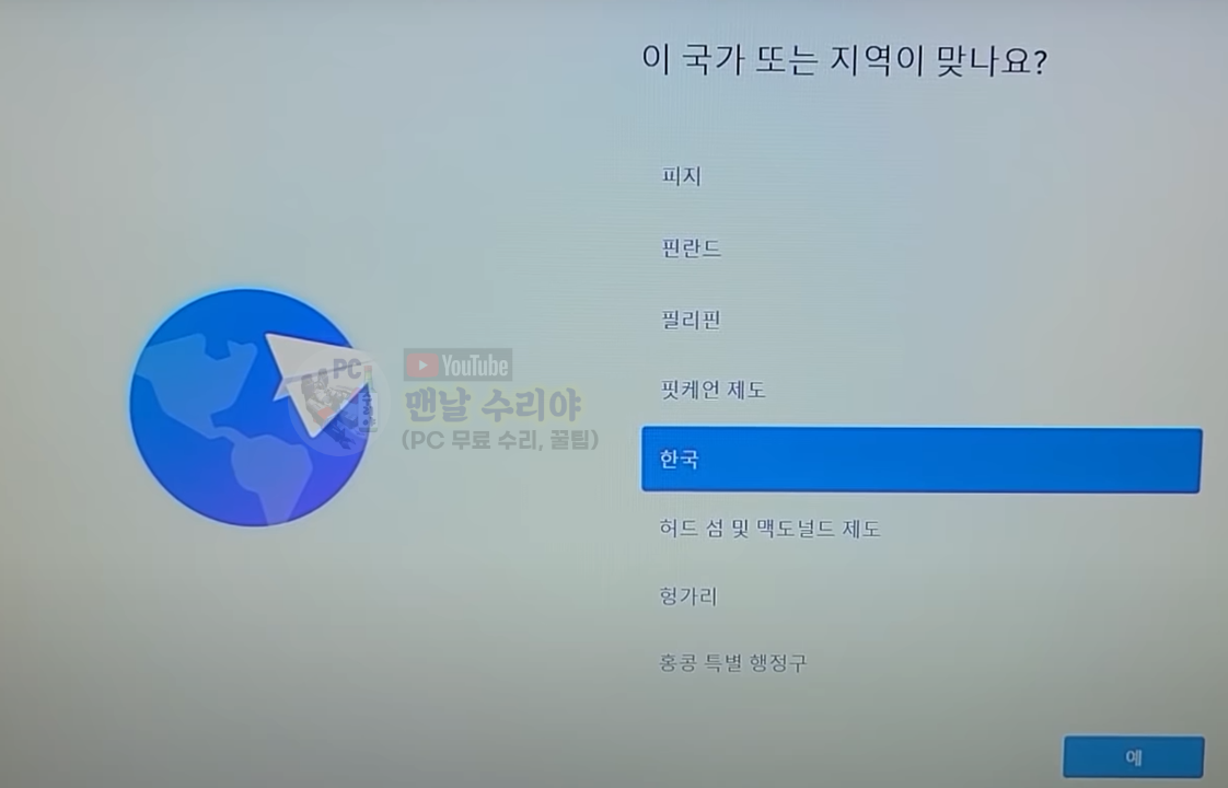 제일 먼저 [국가, 지역] 선택이 나타나는데 [한국] 선택 후 [예]를 누릅니다.