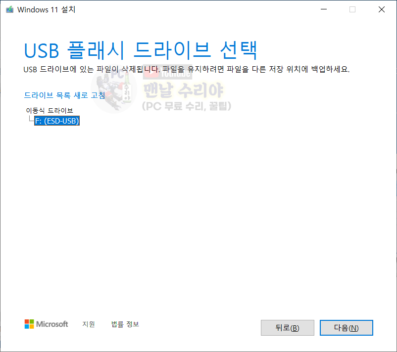 5) 그 다음, 해당 USB를 선택 후 [다음]을 클릭합니다.