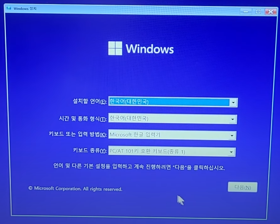 2) 잠시 후, 아래 화면이 나타나고 [설치할 언어, 시간 및 통화형식, 키보드 또는 입력 방법, 키보드 종류]를 변경할 수 있지만, 기본 설정 그대로 [다음]을 누릅니다.