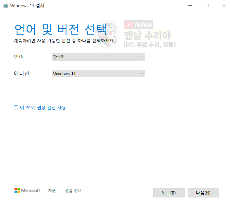 [이 PC에 권장 옵션 사용]에 체크 후 [다음]을 클릭합니다.