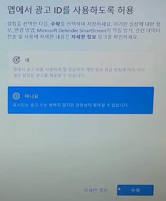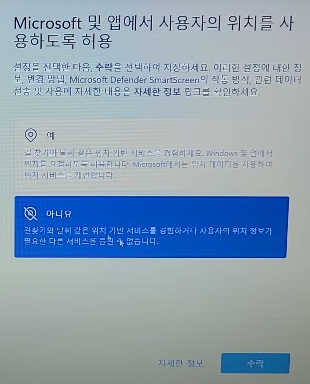 저는 Microsoft 앱에서 사용자 위치 사용은 [아니요]로 하였습니다. [수락] 클릭합니다.