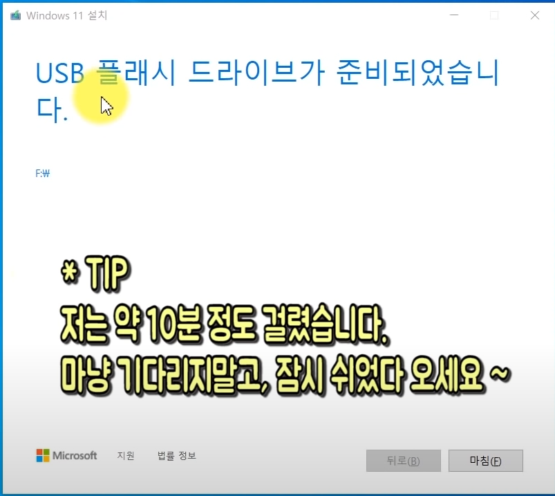 6) 이제 USB에 윈도우11 설치파일이 마운트되고 있습니다. 10~30분 정도 기다려줍니다.