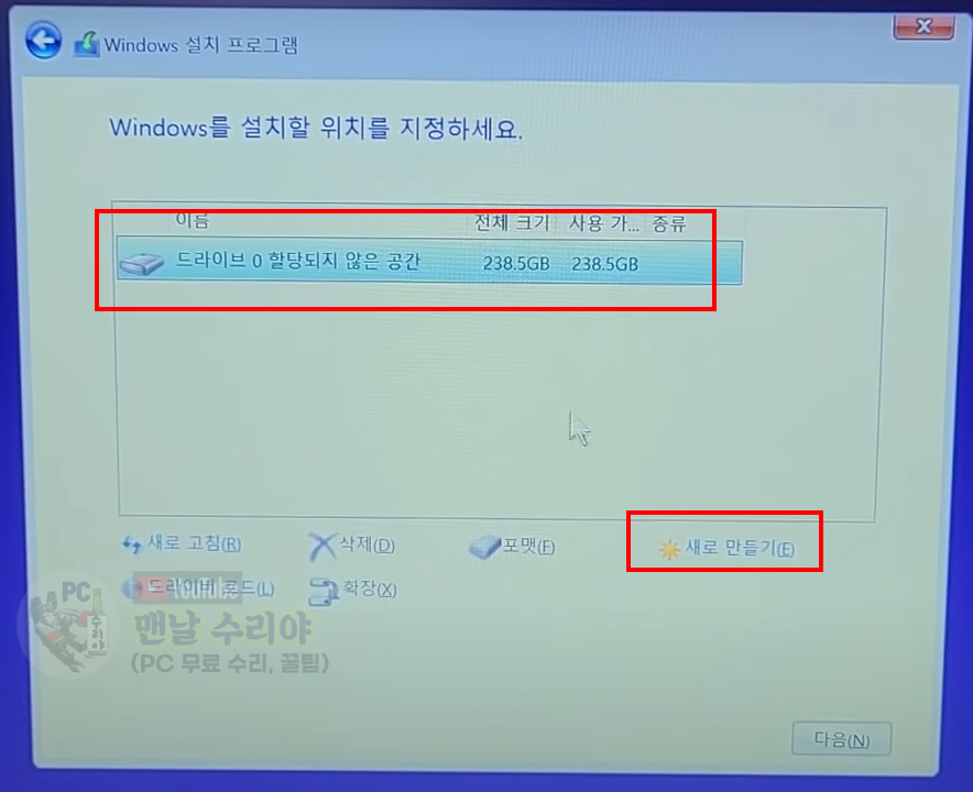 7) 이제 [드라이브 0]이 1개로 통합되면 [새로 만들기]를 눌러 용량을 할당해줍니다.