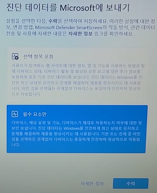 7) 진단 데이터를 Microsoft에 보내기도 [필수 요소만] 선택했습니다.