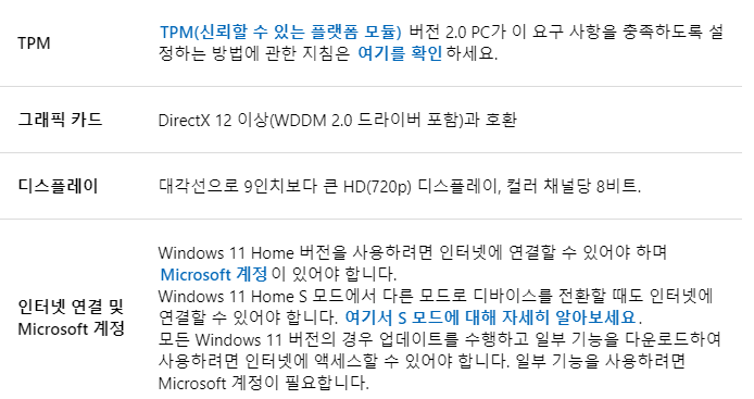 * 여기서 가장 중요한 건 "프로세서 (=CPU)", "TPM"이고, 이 부분 때문에 윈도우11 설치가 불가능한 경우가 많습니다.