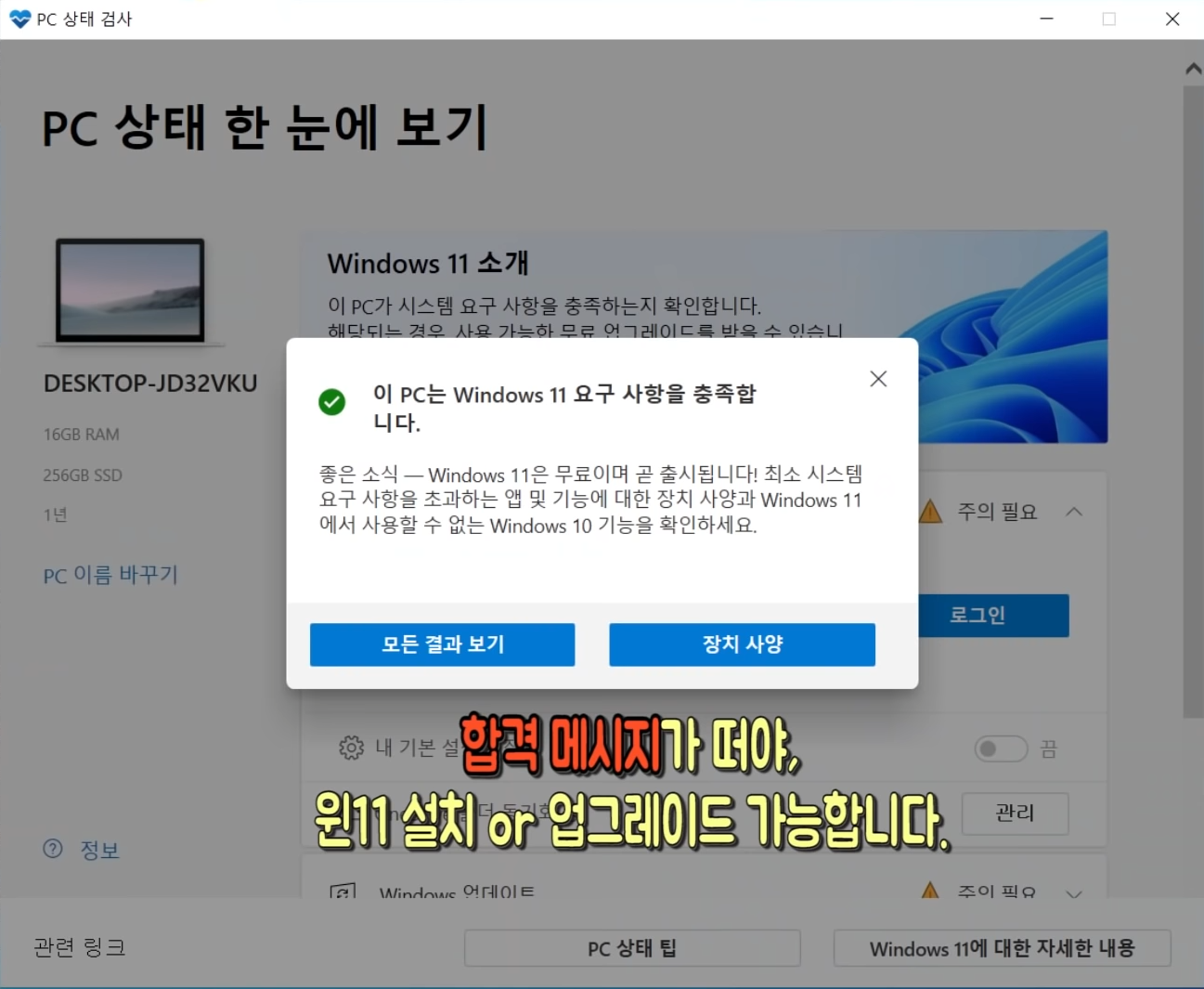 11) 아래와 같이 [이 PC는 Windows 11 요구 사항을 충족합니다]가 나타나면 "합격"입니다.
