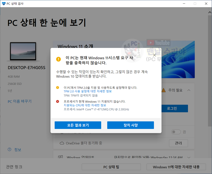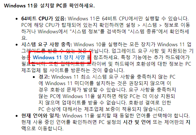3) 그 다음, 위에 표시한 [Windows 11 장치 사양]을 눌러 내 PC에 윈도우11 설치가 가능한 지 확인합니다.