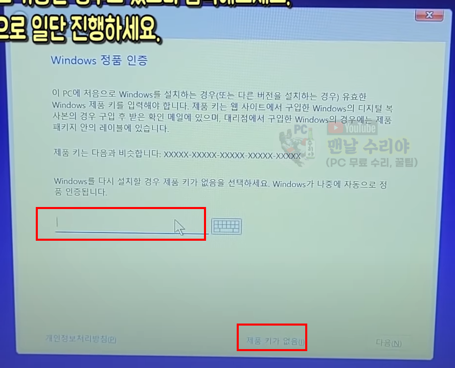 3) 윈도우11 또는 10 정품키가 있다면, 가운데에 입력 후 [다음]을 클릭합니다.