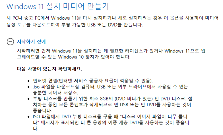 2번째 항목 [Windows 11 설치 미디어 만들기] 아래에 있는 [시작하기 전에]를 클릭하여, 주의사항을 확인합니다.