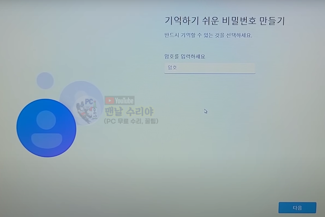 5) 윈도우 로그인을 설정하는 화면인데, 당장은 암호를 안쓰고 싶다면 아무것도 입력하지 않고 [다음]을 클릭합니다.