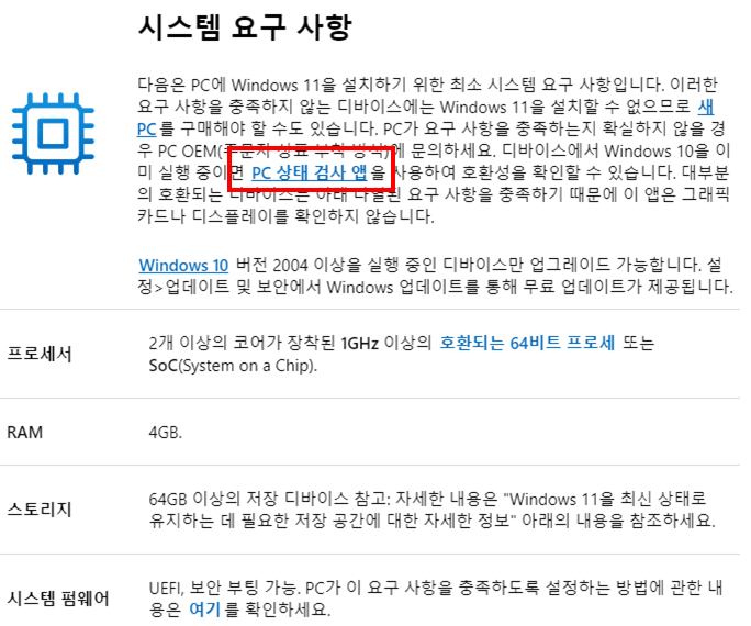 4) 위의 "윈도우11 설치 사양"을 일일이 확인하기 어려우실텐데 [PC 상태 검사 앱]을 클릭해, 한번에 체크할 수 있습니다.