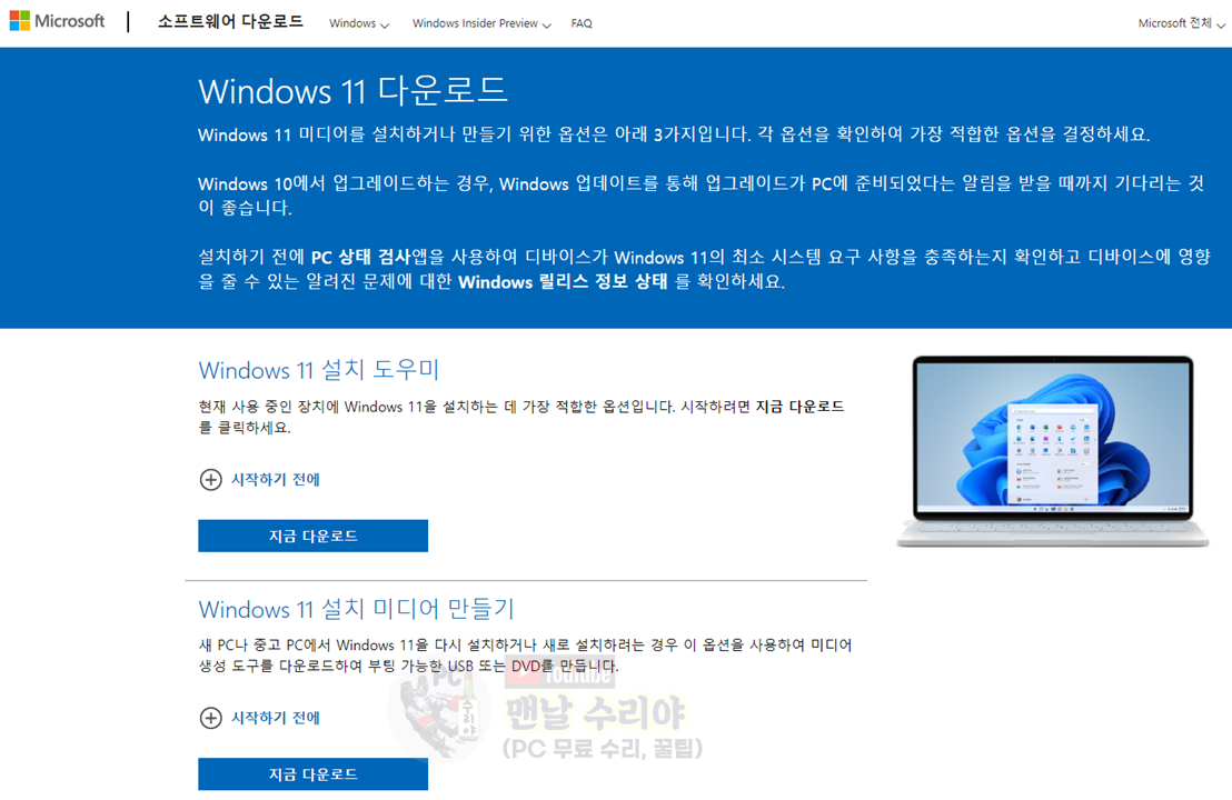그 다음 [Windows 11 설치 미디어 만들기] 아래 쪽에 있는 [지금 다운로드]를 클릭하여,