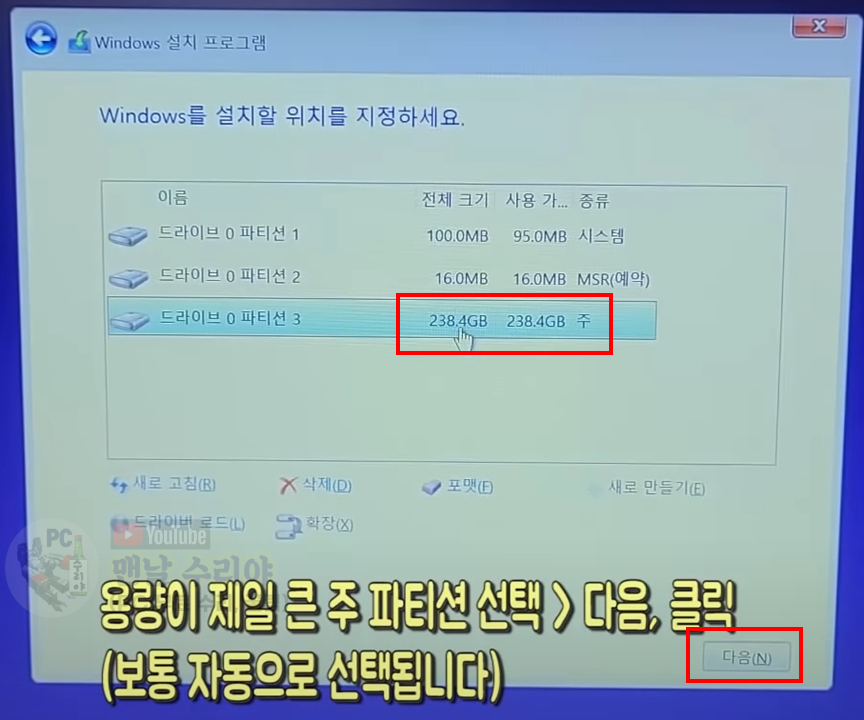 8) 그 다음, 용량이 제일 큰 [주 파티션] 선택 후 [다음]을 클릭합니다.