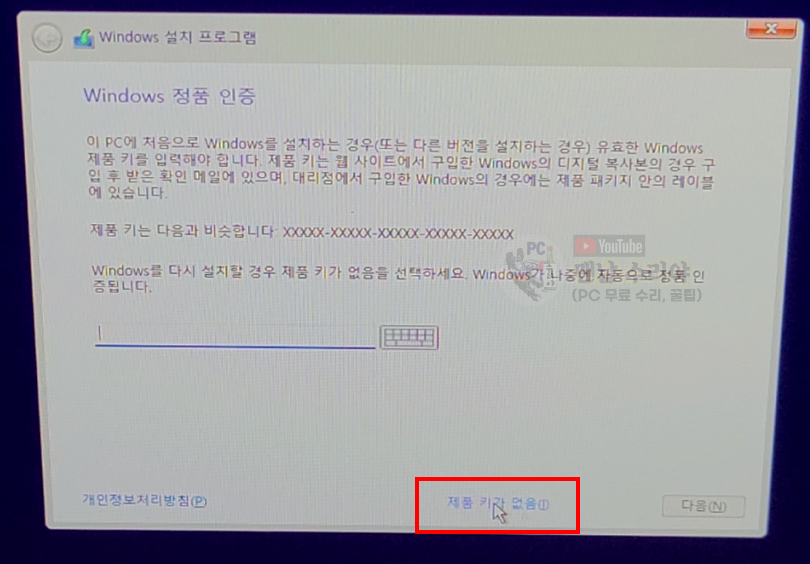 9) 이제 [Windows 정품 인증] 화면에서 [제품 키가 없음]을 클릭합니다.