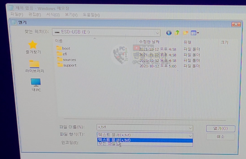 4) 그 다음, 아까 윈도우11 설치파일이 담긴 USB로 이동합니다.