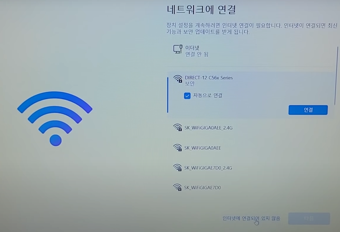 당장 하지 않아도 좋습니다. 저는 [인터넷에 연결되지 않음]을 클릭하겠습니다.