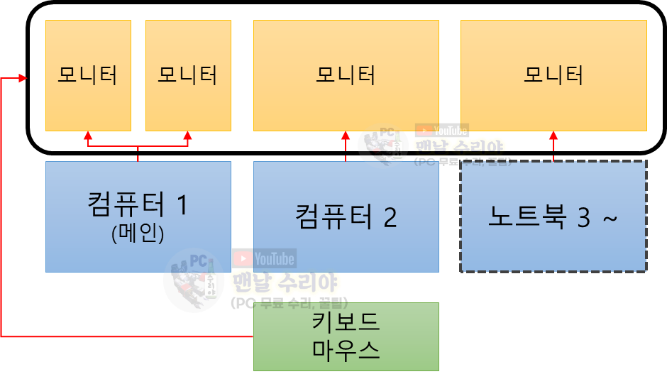 >> 즉, 키보드, 마우스 1대로 여러대의 PC와 모니터를 한번에 제어할 수 있는 것이죠.