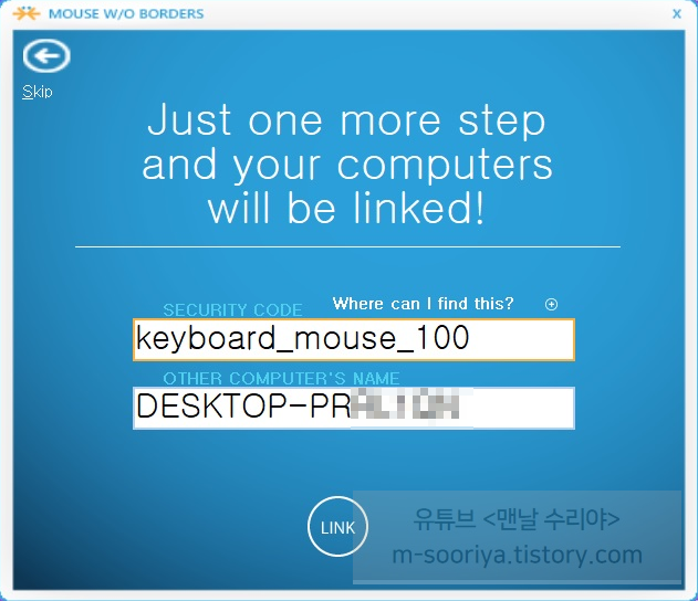 2) 이제 메인 PC의 계정정보?를 입력 후 LINK 를 클릭합니다.