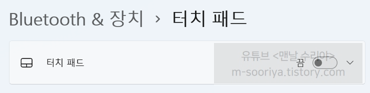 3) 그 다음 [터치패드]의 [켬]을 눌러 [끔]으로 바꿔주시면 됩니다.