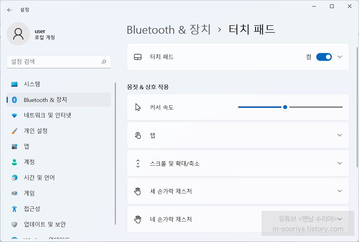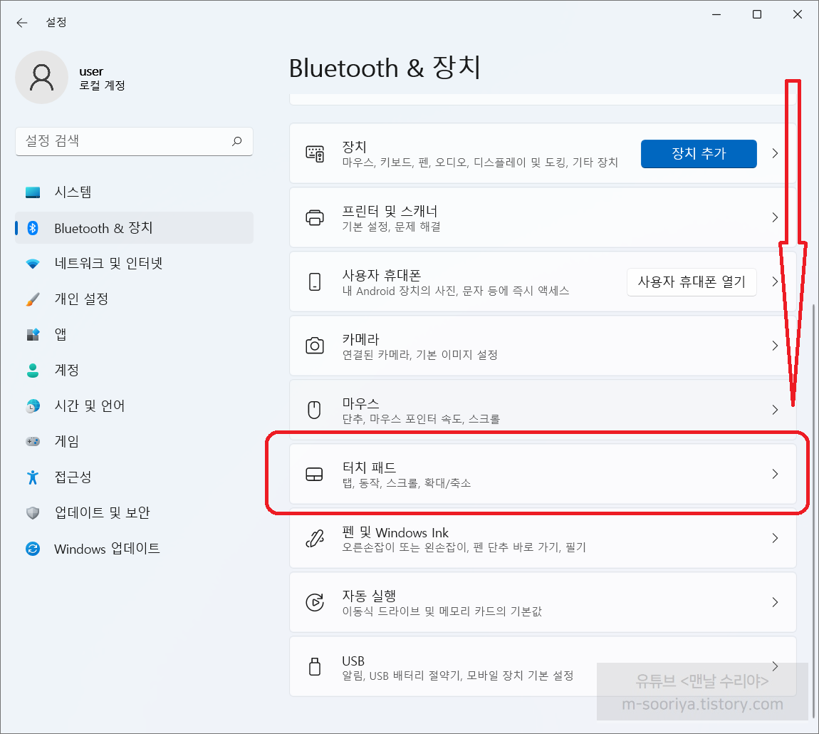 2) 그 다음, 좌측 메뉴의 [Bluetooth & 장치]를 누른 뒤 [터치패드]를 클릭합니다.